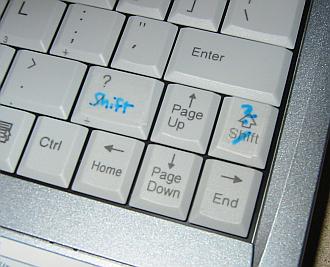 As you can see in the picture, the original location of the right shift key is to the right of the "up" key. The shift key should actually be approximately where the "/" and "up" keys are. I solved this problem by exchanging the "shift" and "/" keys (as marked in blue in the picture). It is much easier for me to get used to the "/" key being in a non-standard location than the "shift" key. (Oh, and by the way: I did not write on my keyboard. I applied a layer of Scotch tape, wrote on that, and then I topped it off with a second layer of Scotch tape to keep the ink from smearing).